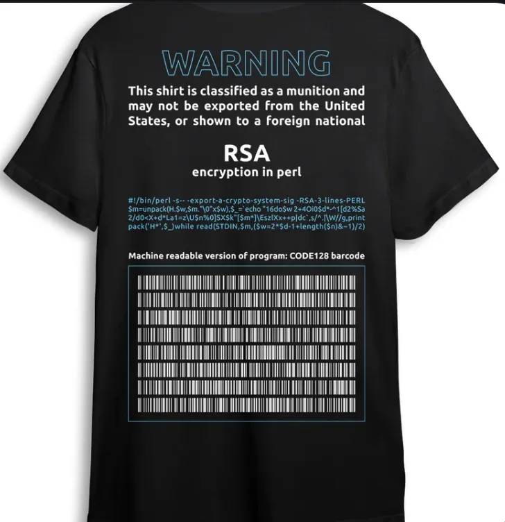 在这一运动中,密码朋克分发印有加密相关信息的T恤,以突出这些法律的荒谬性,Back本人也参与其中。这件T恤警告说,它“被归类为军火,不得从美国出口,也不得向外国公民展示。”