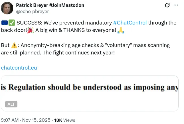 Breyer指出,11月13日的一项澄清确保了“聊天控制不应是强制性的,即使通过后门也不行。”然而,他也提到当前草案中的其他问题,包括允许在没有法院命令的情况下自愿大规模扫描消息,以及新的年龄验证要求,这些要求可能会使匿名电子邮件和即时通讯账户几乎不可能存在,并将17岁以下的青少年排除在许多应用程序之外。