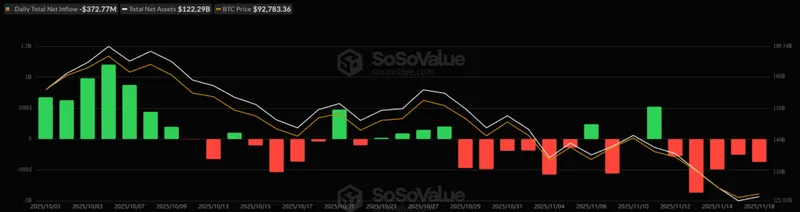 周二,美国比特币现货交易所交易基金(ETF)连续第五天出现流出,总额为3.7277亿美元。这使得净流入总额回落至582.2亿美元,远离600亿美元的关口。