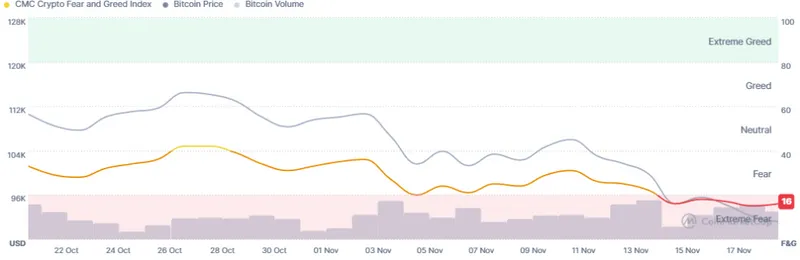 与此同时,过去几天加密市场情绪已进入极度恐慌区,恐惧与贪婪指数今日为16,较昨日的15略有上升。