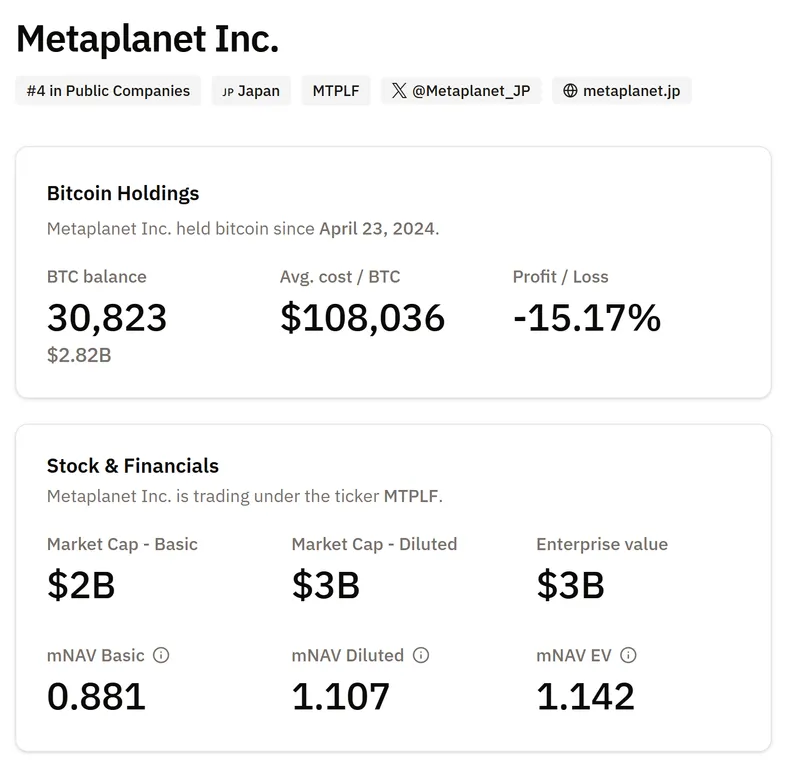 根据BitcoinTreasuries.NET的数据,Metaplanet是全球第四大比特币(BTC)持有公司,目前持有30823枚BTC,价值约28.2亿美元。