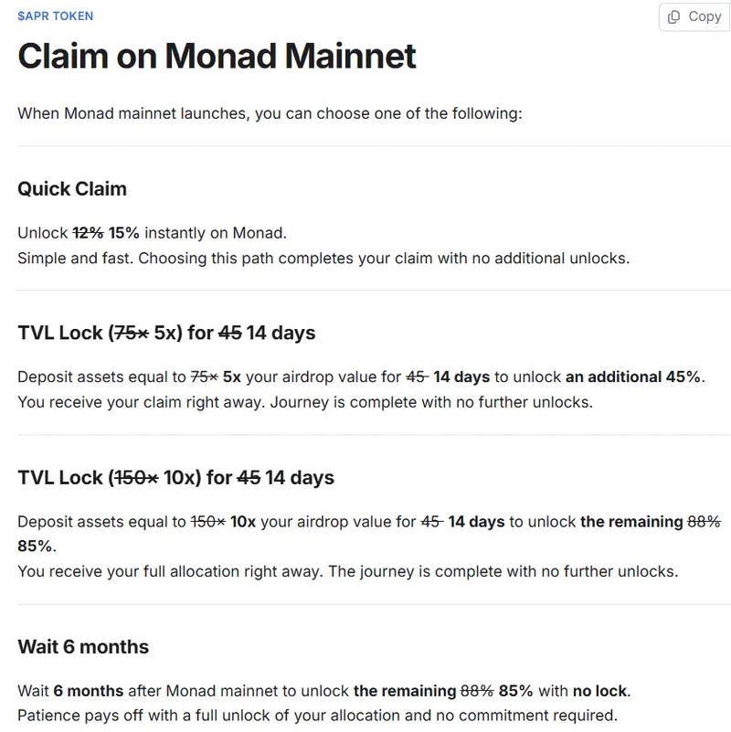 aPriori为了奖励“真实用户”,降低了其Monad主网空投的资格门槛,但周五表示,未发现任何贡献团队或基金会成员参与认领该空投的证据。