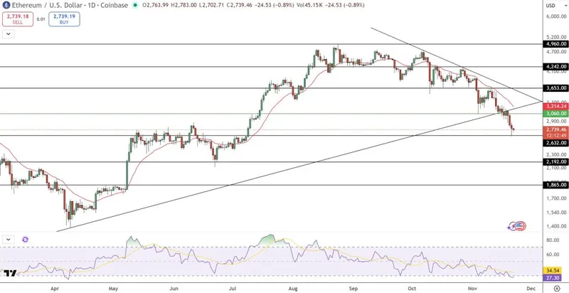 若买方能够守住2630美元的支撑,反弹至2900-3060美元的可能性将增加,随后将重新测试楔形的上边界,接近3214美元。若日线收盘价高于20日EMA,将确认动能的转变。