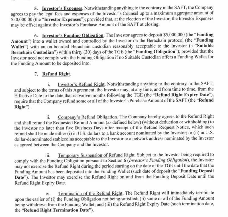 退款机制要求Nova Digital在2025年2月6日代币上线后的30天内向Berachain钱包存入500万美元,以激活该选项。