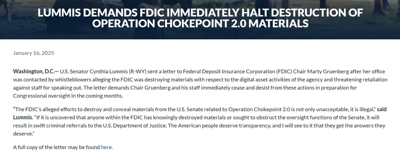 1月,去银行化的担忧出现了新的转折。Lummis的办公室接到匿名举报,指控联邦存款保险公司(FDIC)正在“销毁”与“扼杀行动2.0”相关的材料。