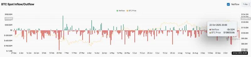 与此同时,比特币现货的净流出量在整个10月份持续存在。10月22日,交易所记录到452万美元的小幅流出,当时比特币价格约为108,033美元。