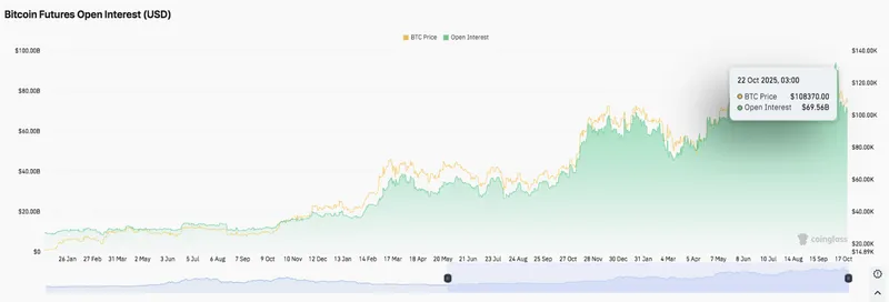 衍生品数据显示,自年中以来,比特币的未平仓合约稳步增长,截至10月22日已达到695.6亿美元,这是2025年以来的最高水平之一,反映出机构投资者的重新参与。分析师指出,这种增长通常会在价格剧烈波动之前出现,因为市场方向明确时,杠杆头寸会加剧波动。