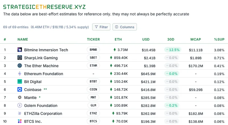 根据strategicethreserve.xyz的数据,BitMine是市场上最大的ETH数字资产财库公司(DAT),其领先优势显著。