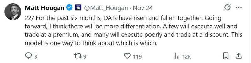 Hougan表示,行业正朝着更明显的分化发展,少数DATs将获得持久的溢价,而其他则可能面临持续的折扣。