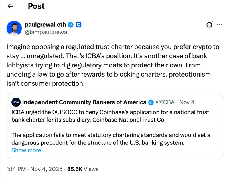 Coinbase首席法务官Paul Grewal在社交媒体上回应称:“这是银行游说者试图挖掘监管护城河以保护自己的又一案例。从撤销法律以打击奖励到阻止牌照,保护主义并非消费者保护。”