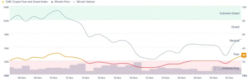 与此同时,加密市场情绪在恐惧区间内再次上升,今日恐惧与贪婪指数为27,较昨日的22有所提高。