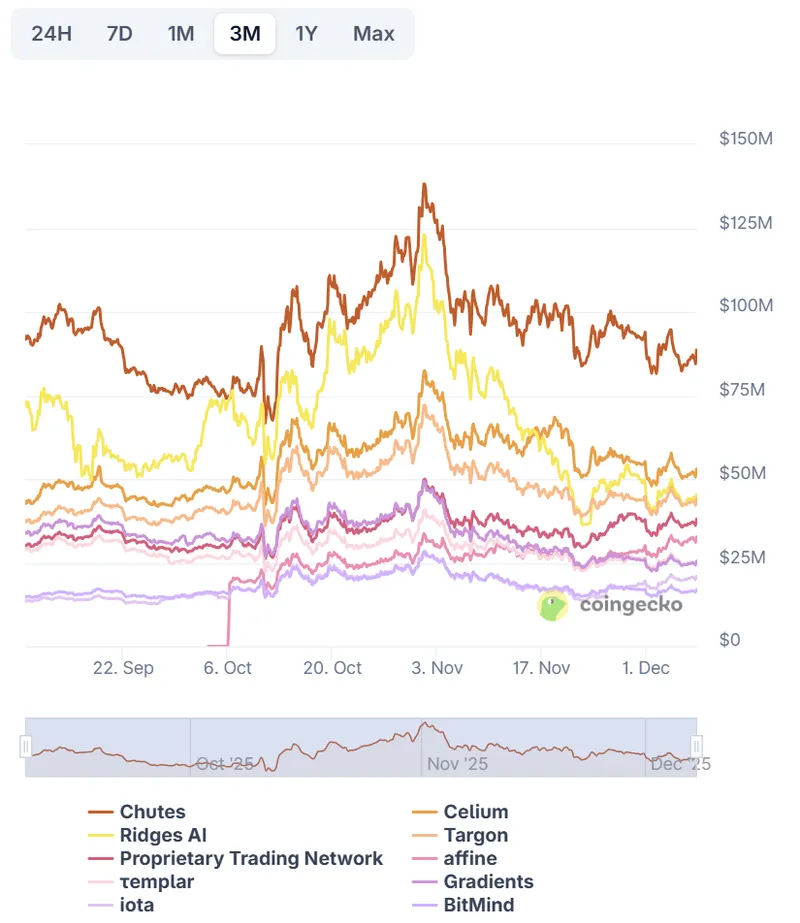 CoinGecko目前列出了超过100个Bittensor子网,合计市值超过8.5亿美元。更全面追踪该生态的Taostats显示,实际共有129个子网,总市值接近30亿美元。