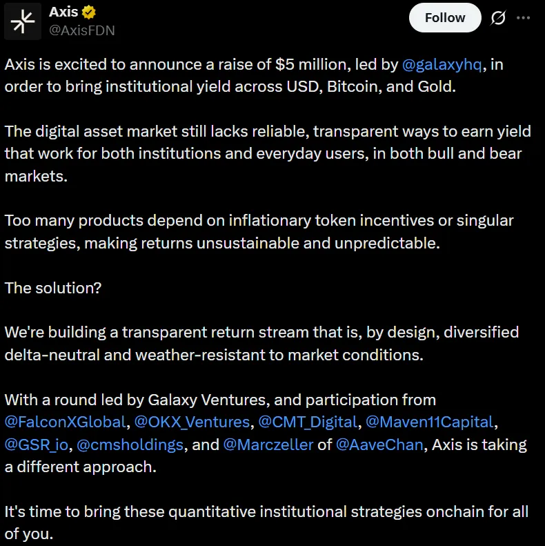 链上收益协议Axis在Galaxy Ventures的领投下,成功筹集500万美元,准备推出一项为比特币、黄金和美元提供敞口的链上收益协议。Axis表示,这笔资金将用于开发其所称的面向数字资产的透明链上收益基础设施。
