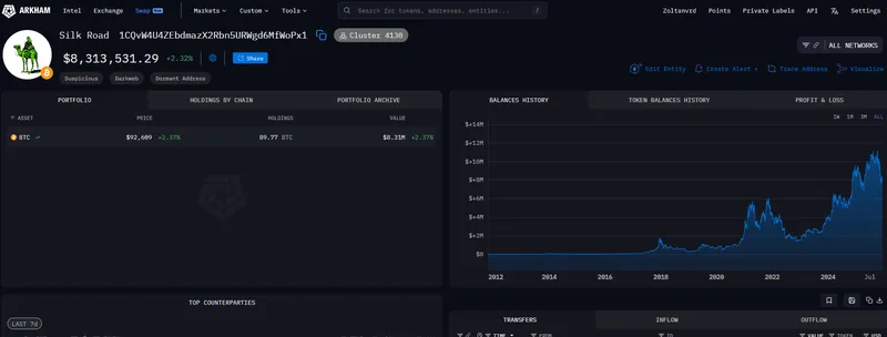 另一个可能属于Ulbricht的Silk Road标记钱包持有830万美元的比特币。根据Arkham的说法,除过去10个月内的三笔小额测试交易外,该钱包已14年未活动。
