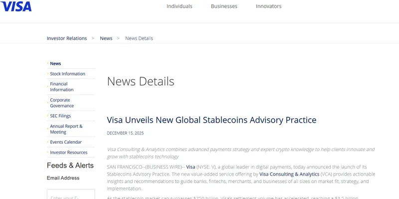 Visa新成立的稳定币咨询部门展示了链上美元从实验阶段向核心支付渠道的转变,银行和金融科技公司将稳定币视为加密货币的重要应用。