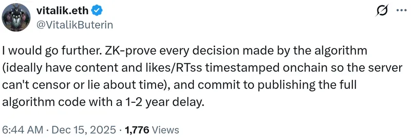 Buterin提议建立一个可验证的系统,利用零知识证明为算法的每个决策提供证据,并在区块链上为所有内容、点赞和转发记录时间戳,以防止服务器审查或篡改。他还建议平台应承诺在1-2年内公开完整的算法代码。