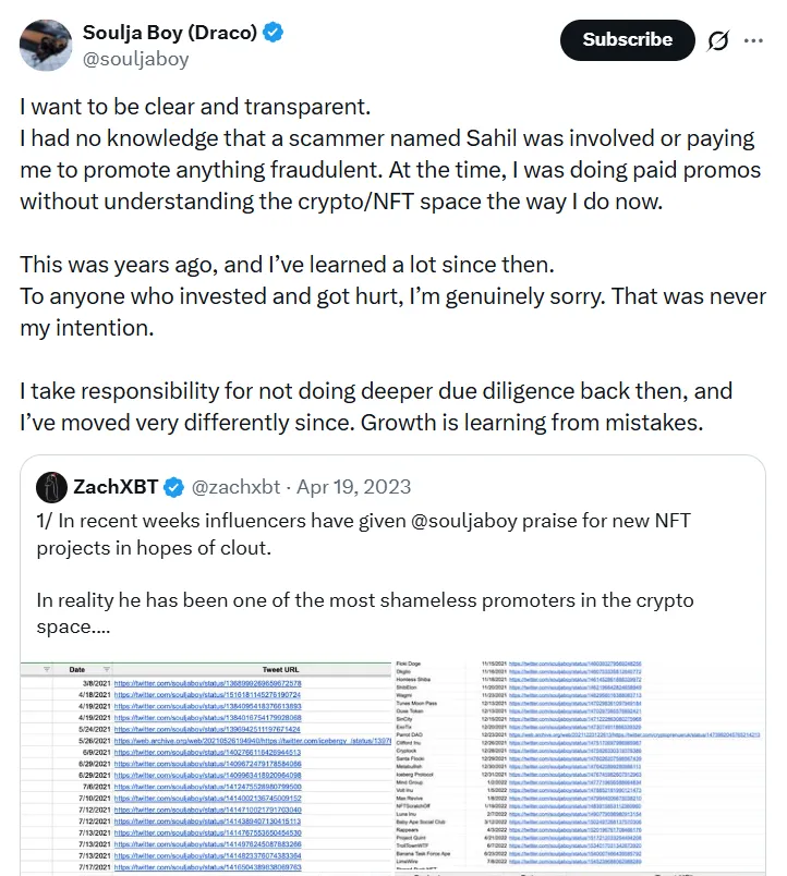ZachXBT质疑道:“为什么要让Soulja Boy有机会欺骗新投资者?”他引用了2023年4月的一篇调查,详细列出了Soulja Boy曾背书的六种代币,这些代币最终都被证实为跑路项目或在背书后不久就被放弃。