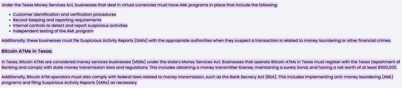 德克萨斯州对ATM运营商的吸引力主要源于其监管结构。州法律将虚拟货币视为货币,根据德克萨斯州货币服务法,将比特币ATM运营商纳入由德克萨斯州银行部监管的熟悉许可制度。