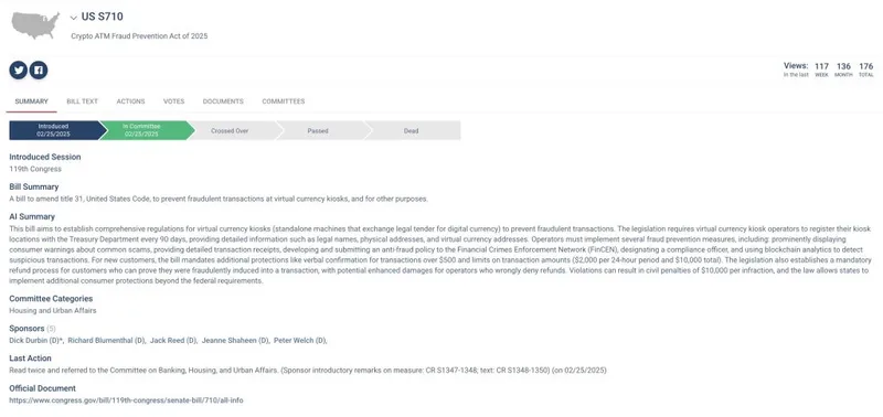 《2025年加密ATM欺诈预防法》作为法案S. 710在美国参议院提出,已阅读两次并转交参议院银行、住房和城市事务委员会,旨在降低欺诈风险,同时提高消费者透明度。