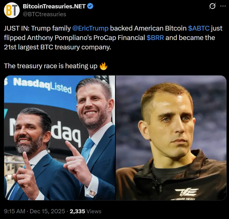 企业对比特币的购买热情持续升温,American Bitcoin已在总持有量上超过ProCap,尽管代理股票下滑且加密市场波动加剧。