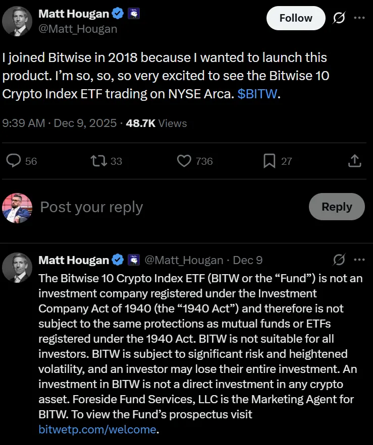 12月10日,Bitwise Asset Management的10加密指数基金(BITW)从场外市场迁移至NYSE Arca交易所,提高了其可见性,并为更多机构投资者的参与打开了大门。该基金现已作为交易所交易产品(ETP)上线。
