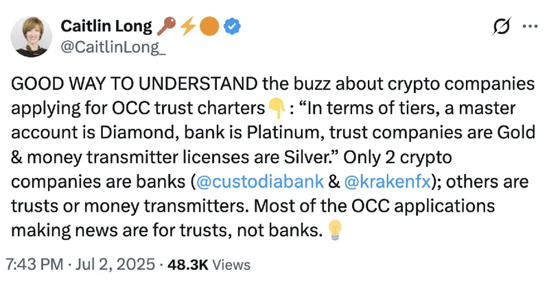 Custodia银行创始人兼CEO Long在7月的一条社交媒体帖子中提到:“在层级上,主账户是钻石级,银行是白金级,信托公司是黄金级,货币传输许可证是白银级。”她还指出,Custodia和Kraken是“唯一两家加密公司银行”。