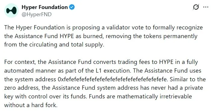 Hyper基金会提议进行一次验证者投票,以正式确认Hyperliquid协议的援助基金地址所持有的HYPE代币将被视为永久不可访问,从而将其排除在资产的流通量和总供应量之外。