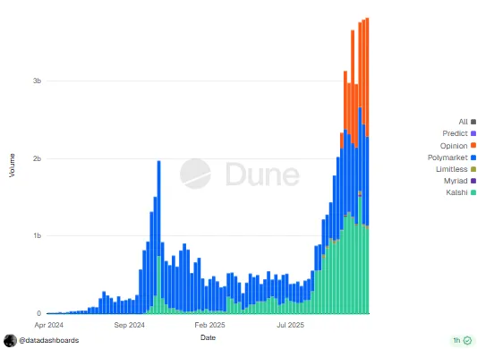 Kalshi、Polymarket和Limitless等平台今年的交易量总计达到440亿美元,其中Kalshi每周的交易量达到10亿美元,主要由体育和政治合约推动。