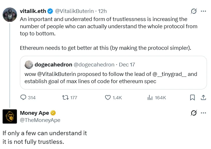 他提到,“增加能够从头到尾理解整个协议的人数是一种重要且被低估的信任共识形式。以太坊需要通过简化协议来提升这一点。”