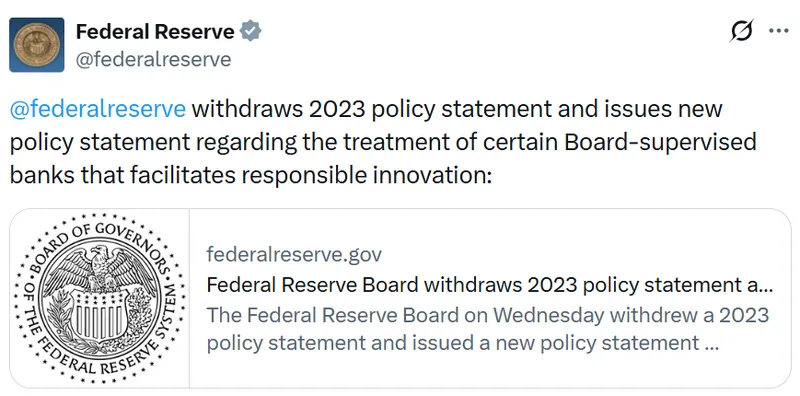 美国联邦储备已撤回一项2023年的指引,该指引限制了美联储监管下的银行(包括未投保存款保险的银行)与加密货币的交互,正值美国监管机构对数字资产采取积极态度之际。