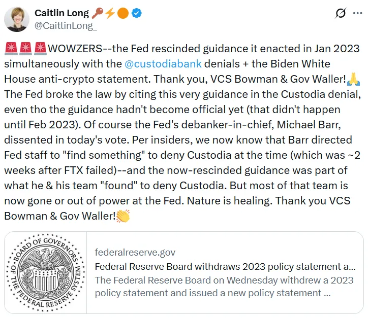 专注于加密货币的Custodia Bank首席执行官Caitlin Long在社交媒体上对此举表示赞赏,并解释说,正是由于该指引,她的机构之前申请美联储主账户时遭到拒绝。