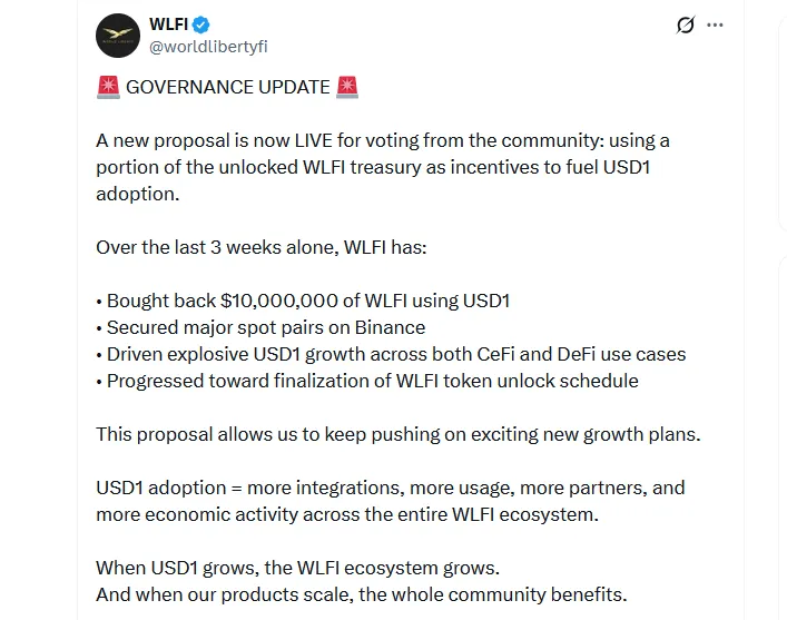 他们补充道:“更多的USD1在流通中将带来对WLFI治理的服务、集成、流动性激励与生态系统项目的更大需求。”