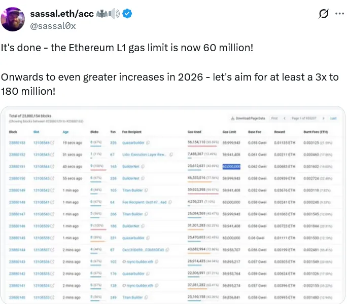 以太坊开发和研究社区的成员共同设定了到2026年底将网络gas限制提高到1.8亿的目标。