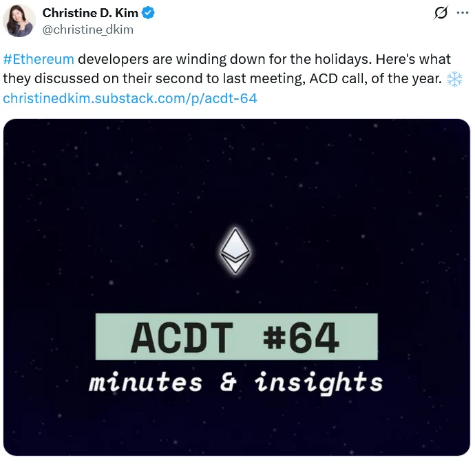 Galaxy Digital研究团队副总裁Christine Kim于周一分享了All Core Developers会议纪要,其中,Nethermind代表表示,开发者应在1月7日的下一次BPO硬分叉后,准备推进gas上限的提升。