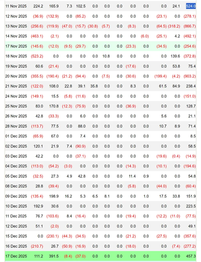 此前在11月和12月初,资金流动情况波动不定,时而小幅流入,时而大幅流出。现货比特币ETF上一次出现超过4.5亿美元的流入是在11月11日,当天的吸金额约为5.24亿美元。
