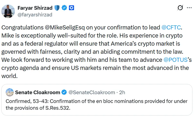 加密交易所Coinbase首席政策官Faryar Shirzad表示,Selig在加密领域的经验将确保美国的加密市场在公平和法律的持久承诺下得到监管。