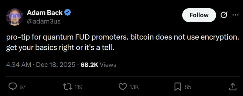 比特币早期核心人物Adam Back等人表示,近期关于量子计算的担忧实际上是一种恐慌和不确定性。他指出,比特币的核心安全模型并不依赖于传统加密,而是采用数字签名方案和加密哈希函数,这些技术在短期内不会受到量子计算机的实质性威胁。