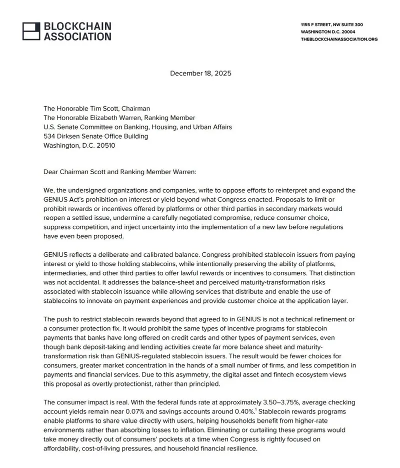 信中指出:“限制稳定币奖励的推动并非技术上的细微调整或消费者保护的修正。”
