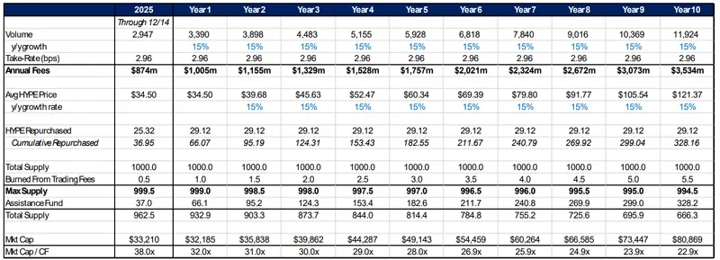 这一预测假设代币价格将保持15%的年复合增长率(CAGR),同时援助基金将回购约2.91亿枚HYPE代币,减少总供应量至6.66亿枚。