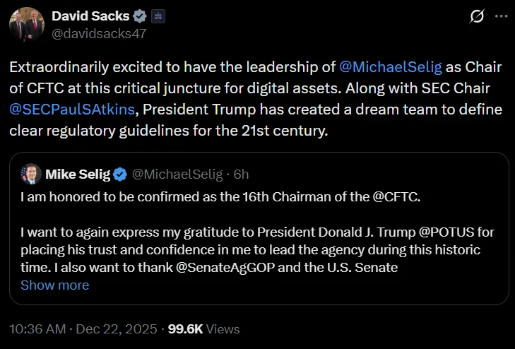 相关推荐:David Sacks称CFTC、SEC人选为加密货币监管"梦之队"