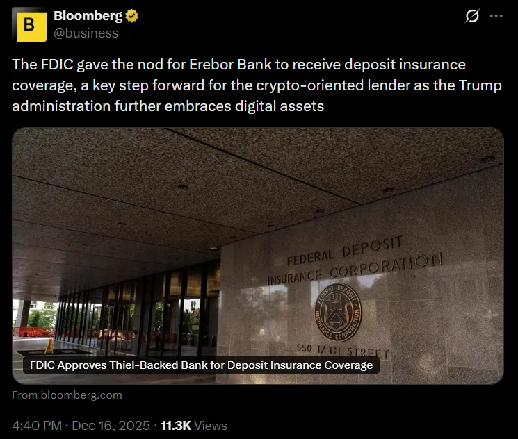 上周,联邦存款保险公司(FDIC)批准了Erebor的存款保险申请,批准有效期为12个月,若银行未能在此期间正式成立或FDIC未予延期,批准将自动失效。