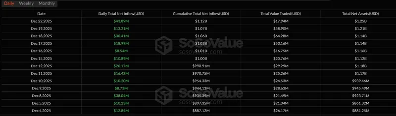 ChainlinkETF在整个12月也呈现出逐步增仓的模式。周一,Chainlink产品新增近200万美元流入,使其累计净流入约达5800万美元。