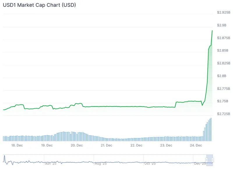 币安推出的"助推计划"使得该稳定币市值从27.4亿美元上升至28.9亿美元。该计划为超过5万美元的USD1灵活产品存款提供高达20%的年化收益率(APR)。