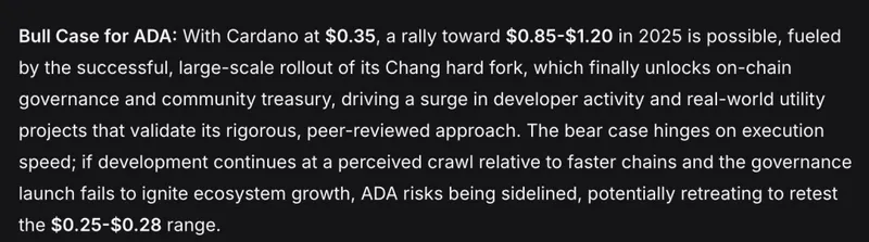 这一预测依赖于Cardano的实际表现。如果Chang硬分叉顺利推出,将解锁链上治理和社区资金,同时现实世界的应用项目将证明其经过同行评审的方法在大规模下的有效性。