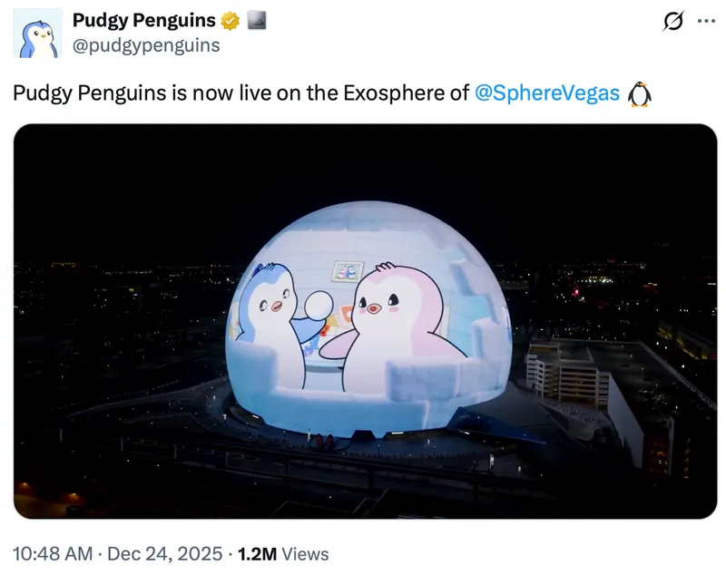 Pudgy Penguins在圣诞周期间于拉斯维加斯Sphere推出了一场动画展示,将其企鹅角色投射到场馆外的大屏幕上。