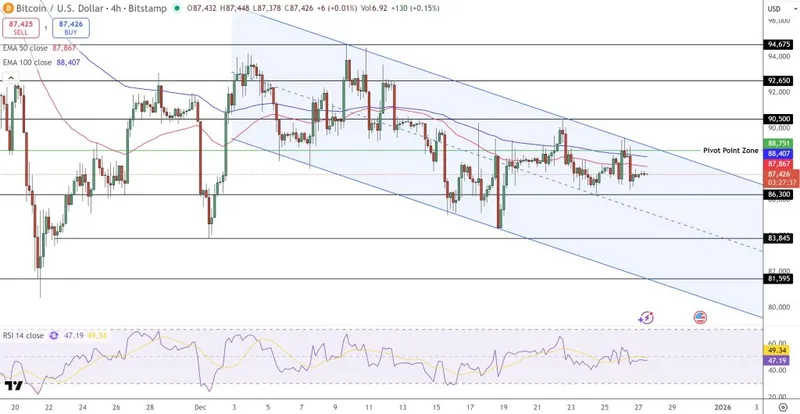 50日EMA接近87,800美元,100日EMA接近88,400-88,500美元。