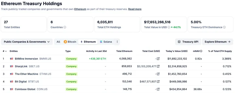 此外,Lee还是BitMine Immersion Technologies的董事长,该公司专注于以太币的财务管理。据CoinGecko数据显示,该公司已报告持有4,066,062枚ETH。