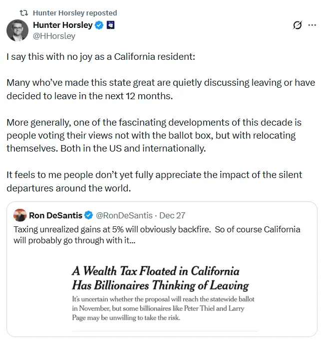 Castle Island Ventures创始合伙人Nic Carter和ProCap BTC首席投资官Jeff Park也认为,这一税收将促使亿万富翁将资本撤出加州。
