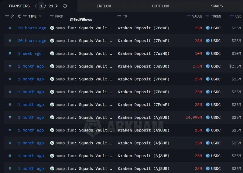 根据Arkham的数据,Pump.fun在过去24小时内向Kraken存入了约5万美元。
