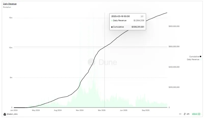根据DefiLlama的数据,Pump.fun在2025年第四季度的收入约为7410万美元,自推出以来的总收入接近9.356亿美元。